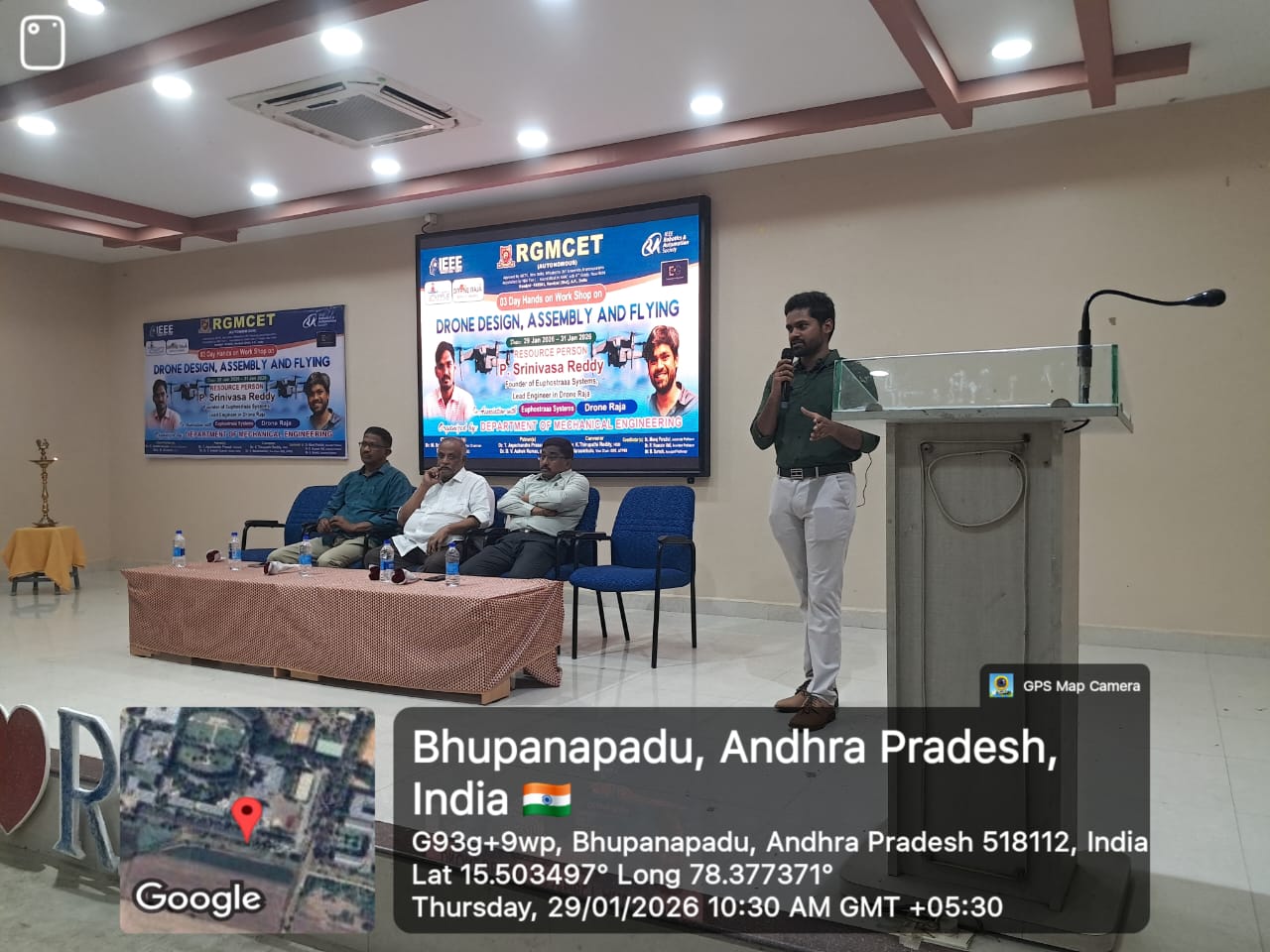 The Dept. of ME organized a hands-on workshop on “Drone Design, Assembly and Flying” by Mr. P. Srinivas Reddy, Founder of Euphostraaa Systems and Lead Engineer at Drone Raja.