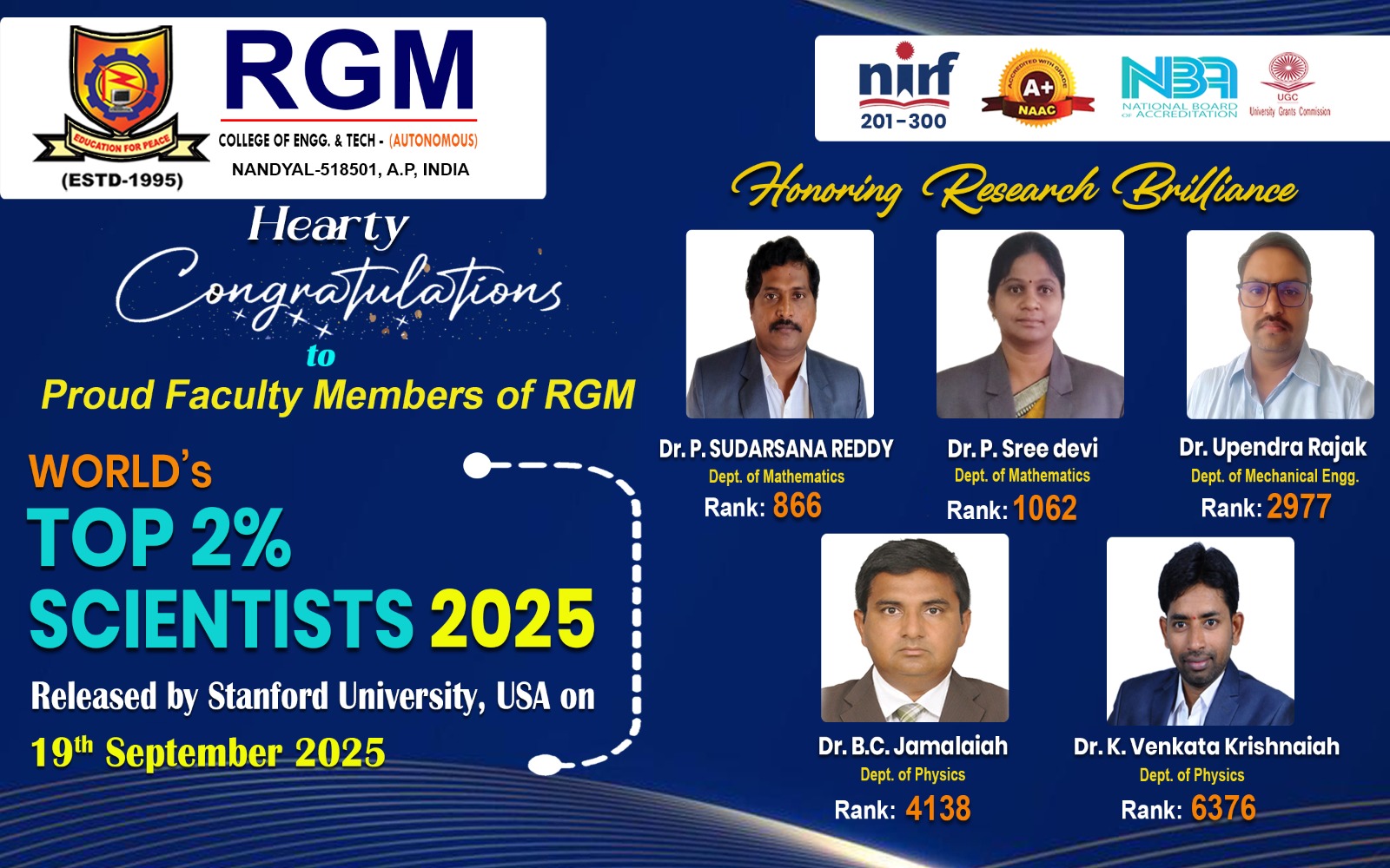It is the dedicated commitment and efforts of our Chairman, the man with vision "Vidyarathna" Dr. M. Santhiramudu, who started the institution with a motto "EDUCATION FOR PEACE". RGMCET is a road of elegant educational journey, yet path breaking in different dimensions.