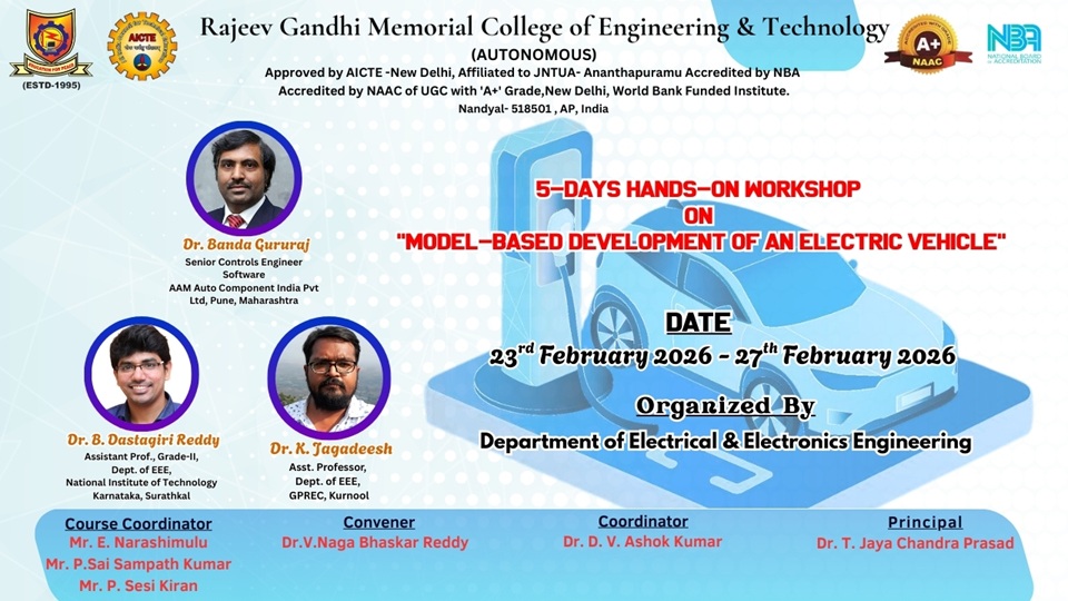 The Department of Electrical & Electronics Engineering (EEE) has been started in 1995, with an intake of 60 students and with the growing demand for electrical engineering graduates; the intake has increased to 90 in the year 2001, 120 in the year 2002, 180 in the year 2014 and in a short span i.e by the end of 2015 the intake increased to 240. The Department is offering M.Tech in Power Electronics since 2002 with a sanctioned initial intake of 18 and subsequently the intake has been increased to 25 in 2003 and 36 in the year 2011. Department also offers fulltime Ph.D from the year 2014 and recognized as research center by JNTUA, Anantapuramu.