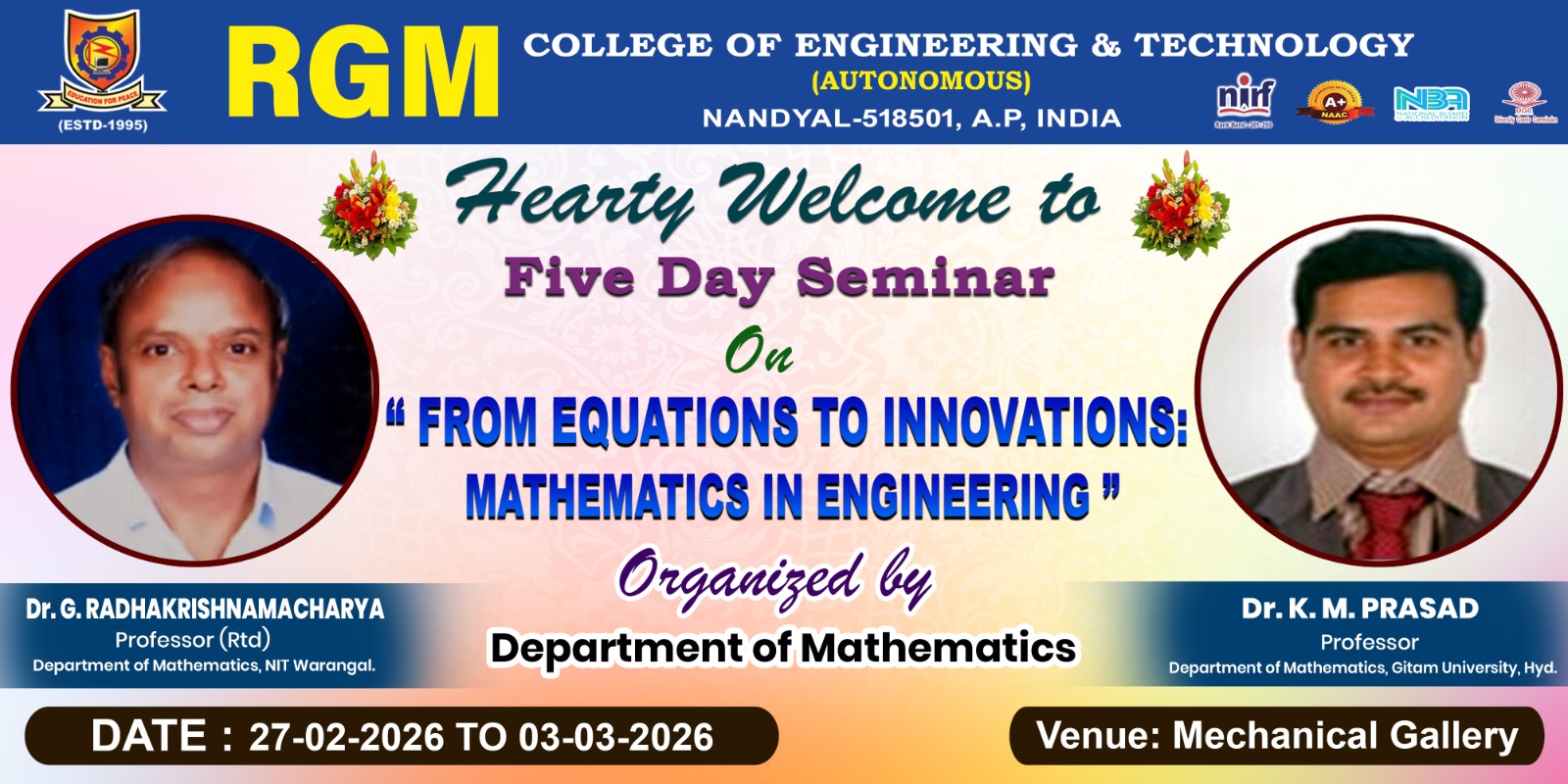 The Department of Mathematics was set up in 1995 and is one of the pioneering departments of the institution that offers assistance to many Information Technology and Engineering courses of the institute. It is committed to the cost of quality education in mathematics that forms the basis for all the other fields and IT, a field growing in leaps and bounds. International Collaboration in the exchange of research activities is a regular practice in the department. Several eminent mathematicians visit the Department from time to time and collaborate with the faculty members of the Department. Research monograph brought out by well-known international publishers from part of the research output of the members of the faculty.