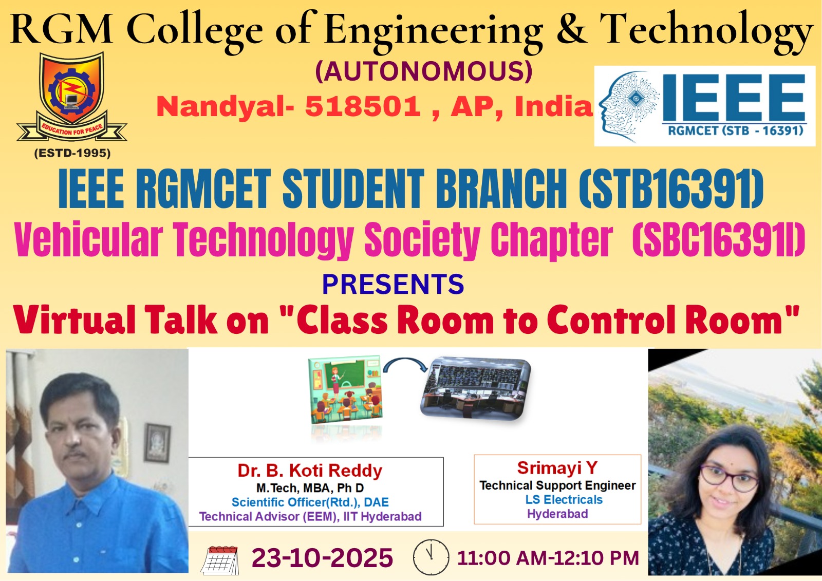 • The IEEE RGMCET Student Branch (STB16391), in association with the IEEE Vehicular Technology Society Chapter, is organizing a Virtual Talk on “Classroom to Control Room” on 23rd October 2025... For further details Click here.. Date: 21.10.2025