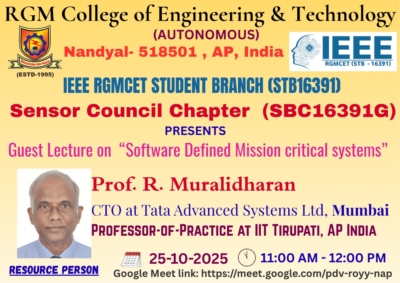 • The IEEE RGMCET Student Branch (STB16391), in collaboration with the IEEE Sensors Council Chapter (SBC1639IG), is organizing a Guest Lecture on “Software Defined Mission-Critical Systems” on 25th October 2025... For further details Click here.. Date: 22.10.2025