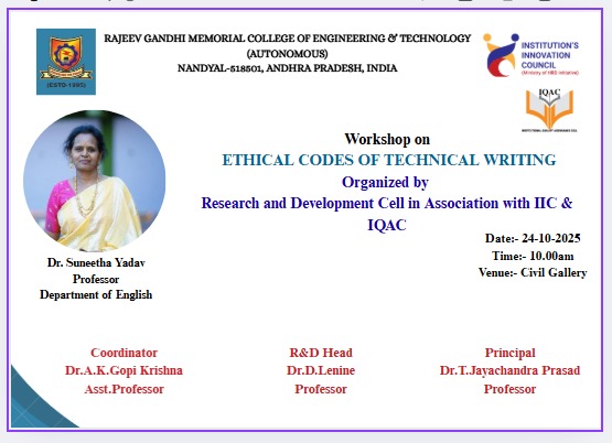 • Research Development Cell, RGMCET is organizing a workshop on “Ethical Codes of Technical Writing,” in association with the Institution’s Innovation Council (IIC) and the Internal Quality Assurance Cell (IQAC), on 24 October 2025.... For further details Click here.. Date: 21.10.2025