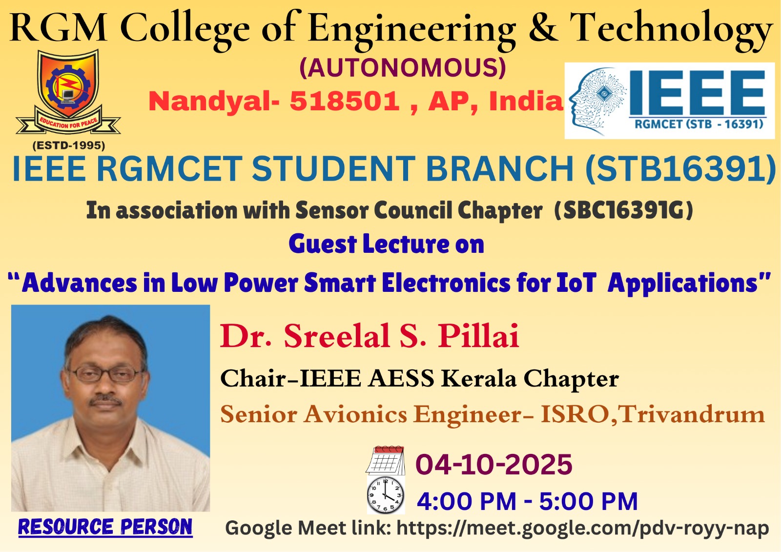 • The IEEE RGMCET Student Branch (STB16391), in collaboration with the IEEE Sensors Council Chapter (SBC1639IG), is organizing a Guest Lecture on “Advances in Low Power Smart Electronics for IoT Applications” on 4th October 2025... For further details Click here.. Date: 29.09.2025