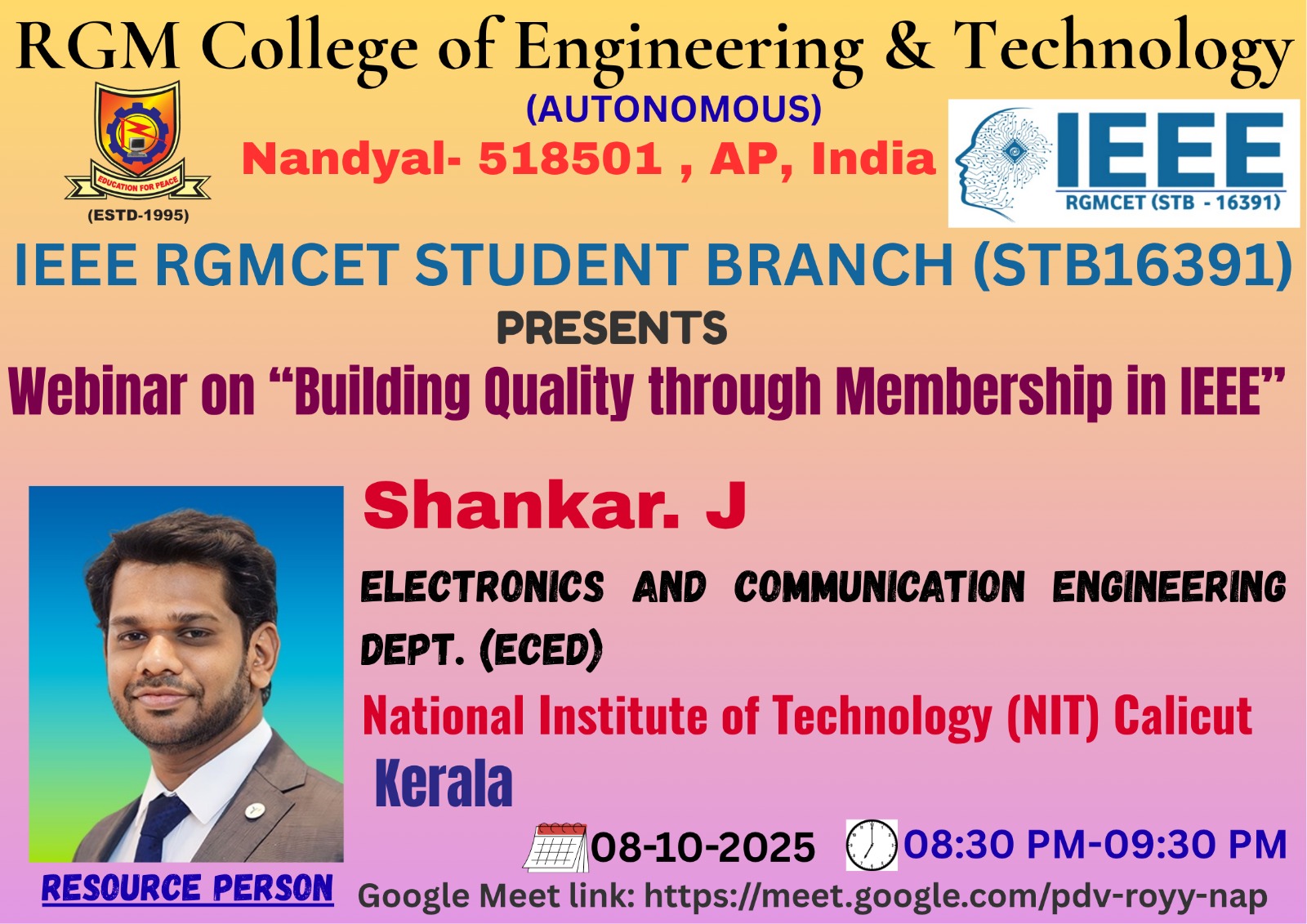 • The IEEE RGMCET Student Branch (STB16391) is presenting a guest lecture on “Building Quality through Membership in IEEE” on 8th October 2025.... For further details Click here.. Date: 04.10.2025