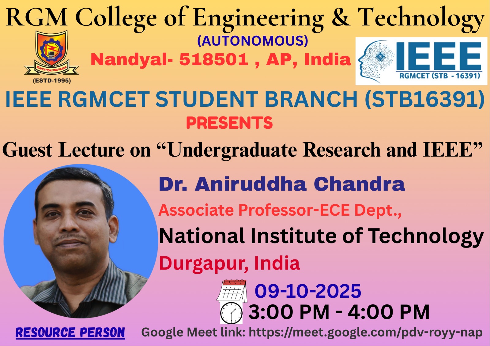 • The IEEE RGMCET Student Branch (STB16391) is presenting a guest lecture on “Undergraduate Research and IEEE” on 9th October 2025.... For further details Click here.. Date: 04.10.2025