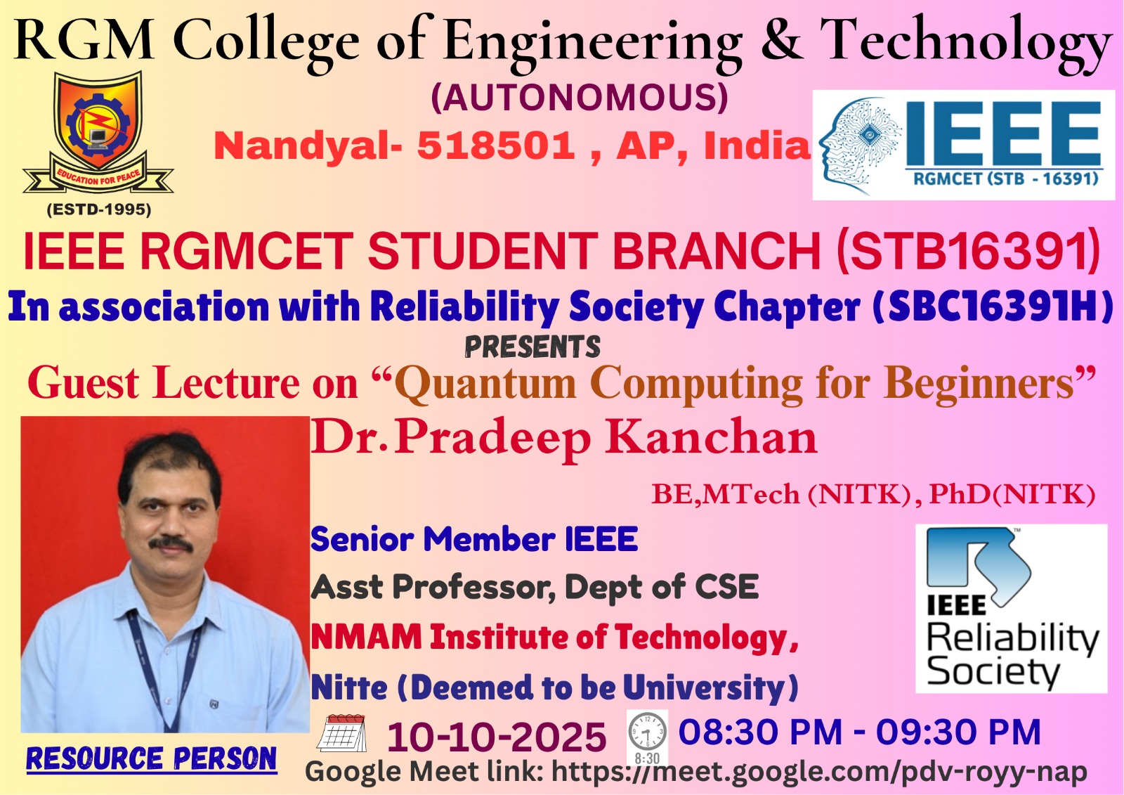 • The IEEE RGMCET Student Branch (STB16391), in association with the Reliability Society Chapter, is presenting a guest lecture on “Quantum Computing for Beginners” on 10th October 2025.... For further details Click here.. Date: 04.10.2025