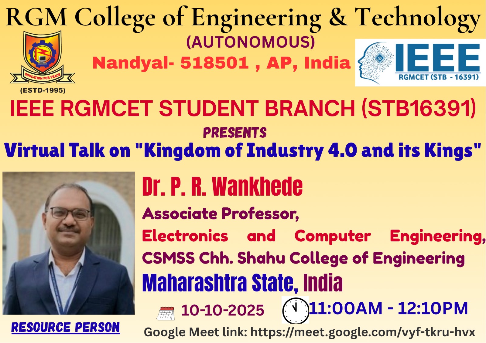 • The IEEE RGMCET Student Branch (STB16391) is presenting a virtual talk on “Kingdom of Industry 4.0 and its Kings” on 10th October 2025.... For further details Click here.. Date: 10.10.2025