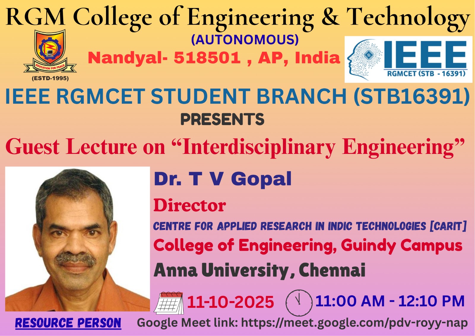 • The IEEE RGMCET Student Branch (STB16391) is presenting a guest lecture on “Interdisciplinary Engineering” on 11th October 2025.... For further details Click here.. Date: 04.10.2025