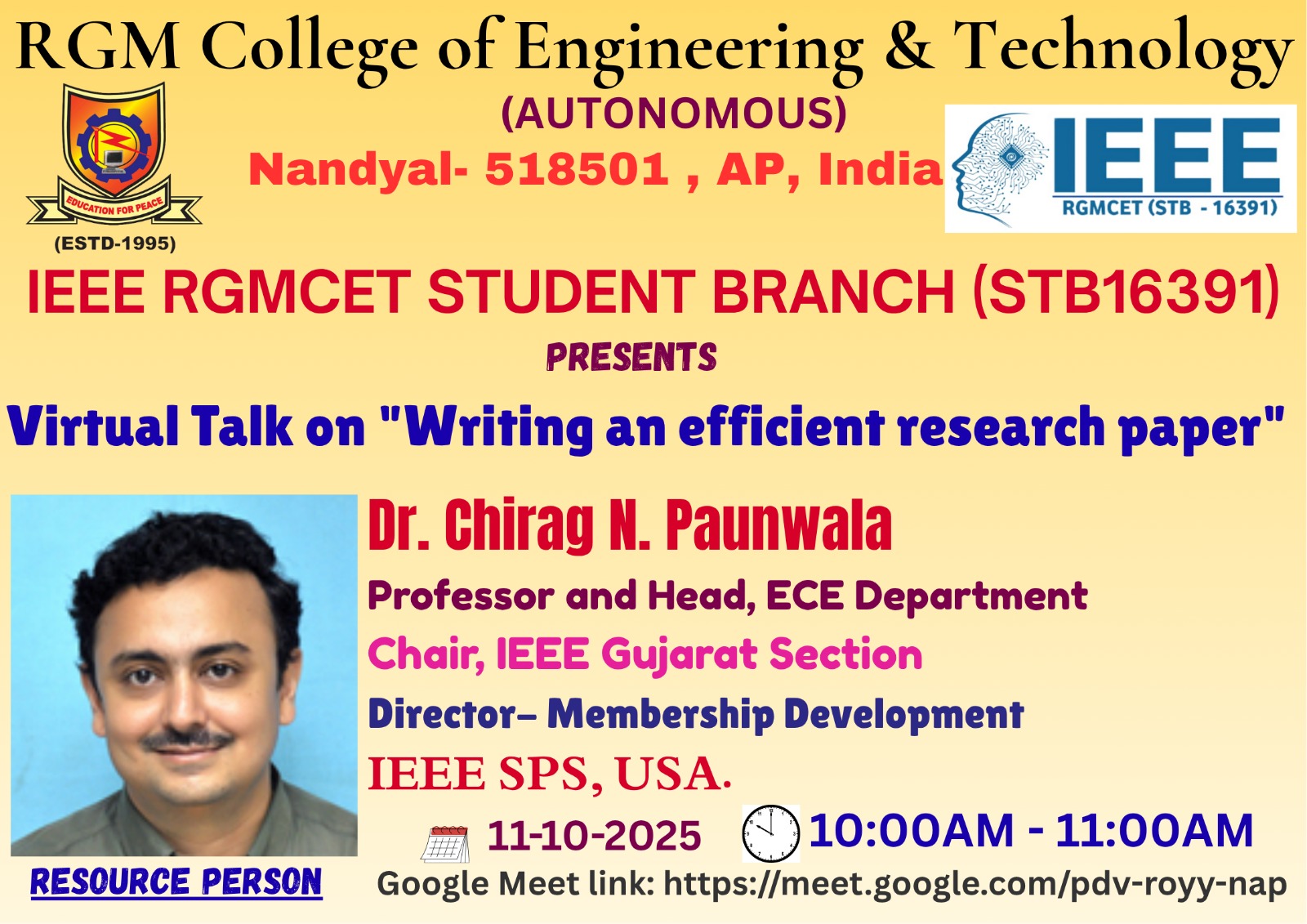 • The IEEE RGMCET Student Branch (STB16391) is presenting a virtual talk on “Writing an Efficient Research Paper” on 11th October 2025.... For further details Click here.. Date: 04.10.2025