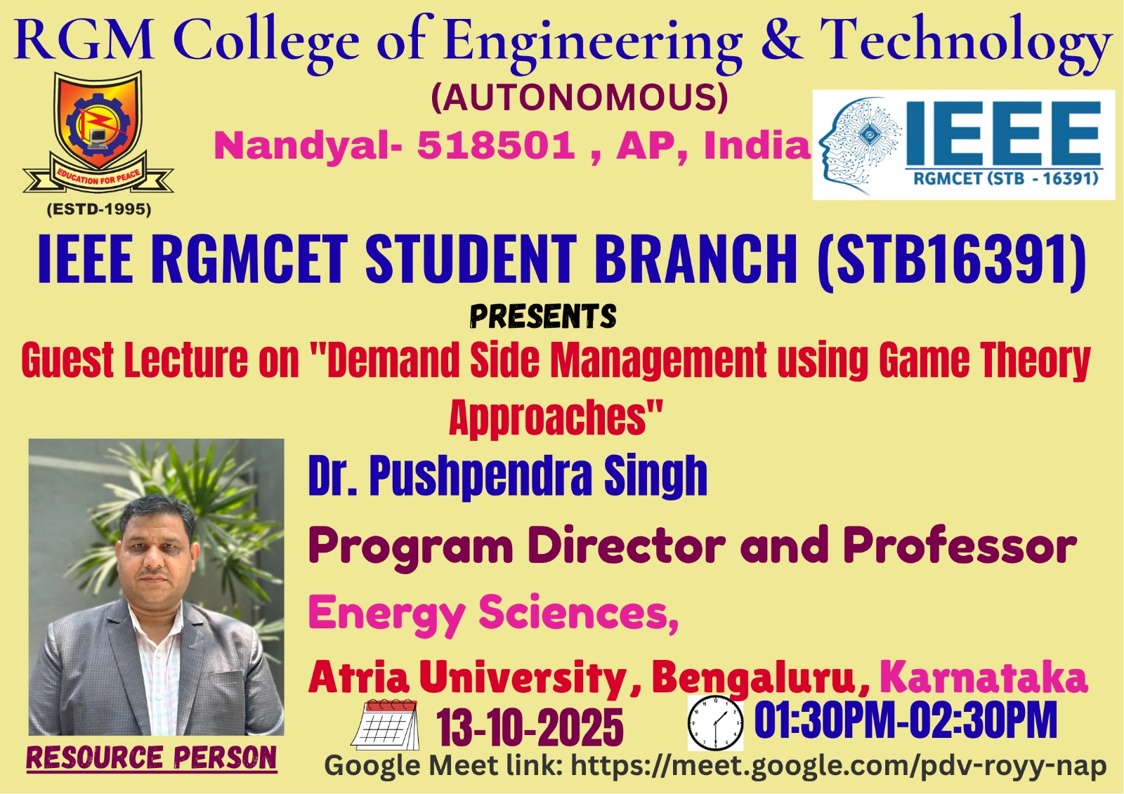 • The IEEE RGMCET Student Branch (STB16391) is organizing a Guest Lecture on “Demand Side Management using Game Theory Approaches” on 13th October 2025... For further details Click here.. Date: 10.10.2025