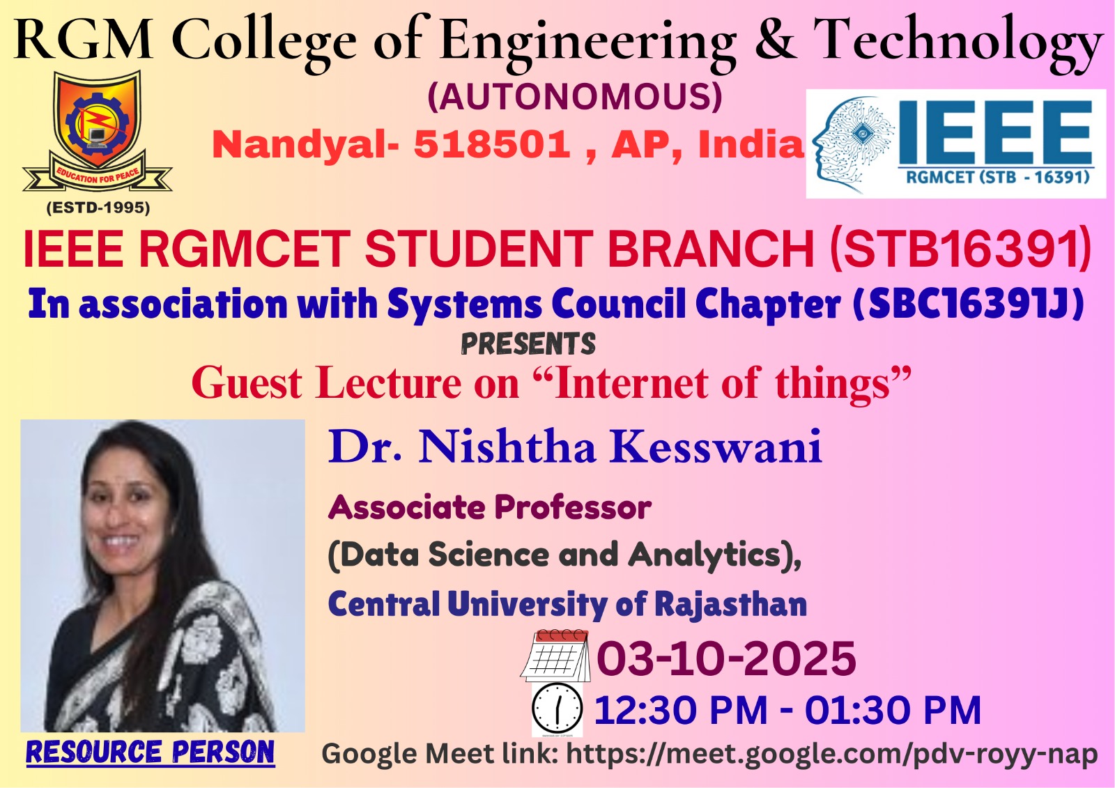 • The IEEE RGMCET Student Branch (STB16391) is organizing a Guest Lecture on “Internet of Things” on 3rd October 2025.. For further details Click here.. Date: 29.09.2025