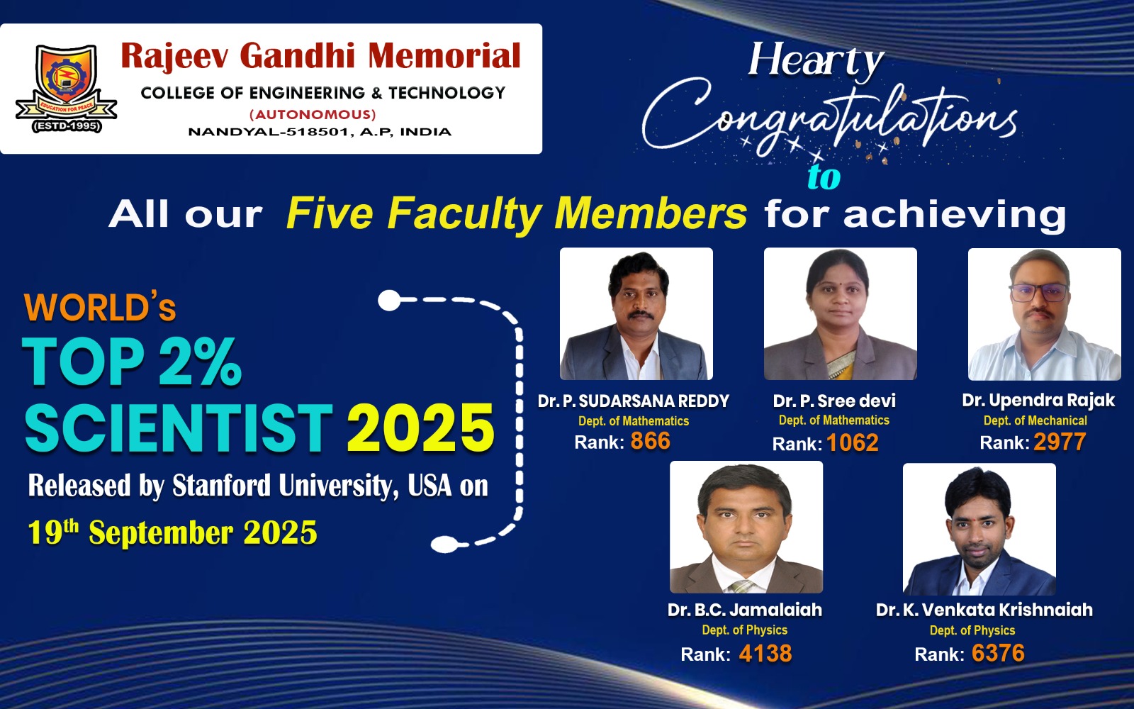 Rajeev Gandhi Memorial College of Engineering and Technology was founded in the year 1995. It is located in a 32.04 acre sprawling campus on NH-40 (old NH-18) at Nandyal, Andhra Pradesh.