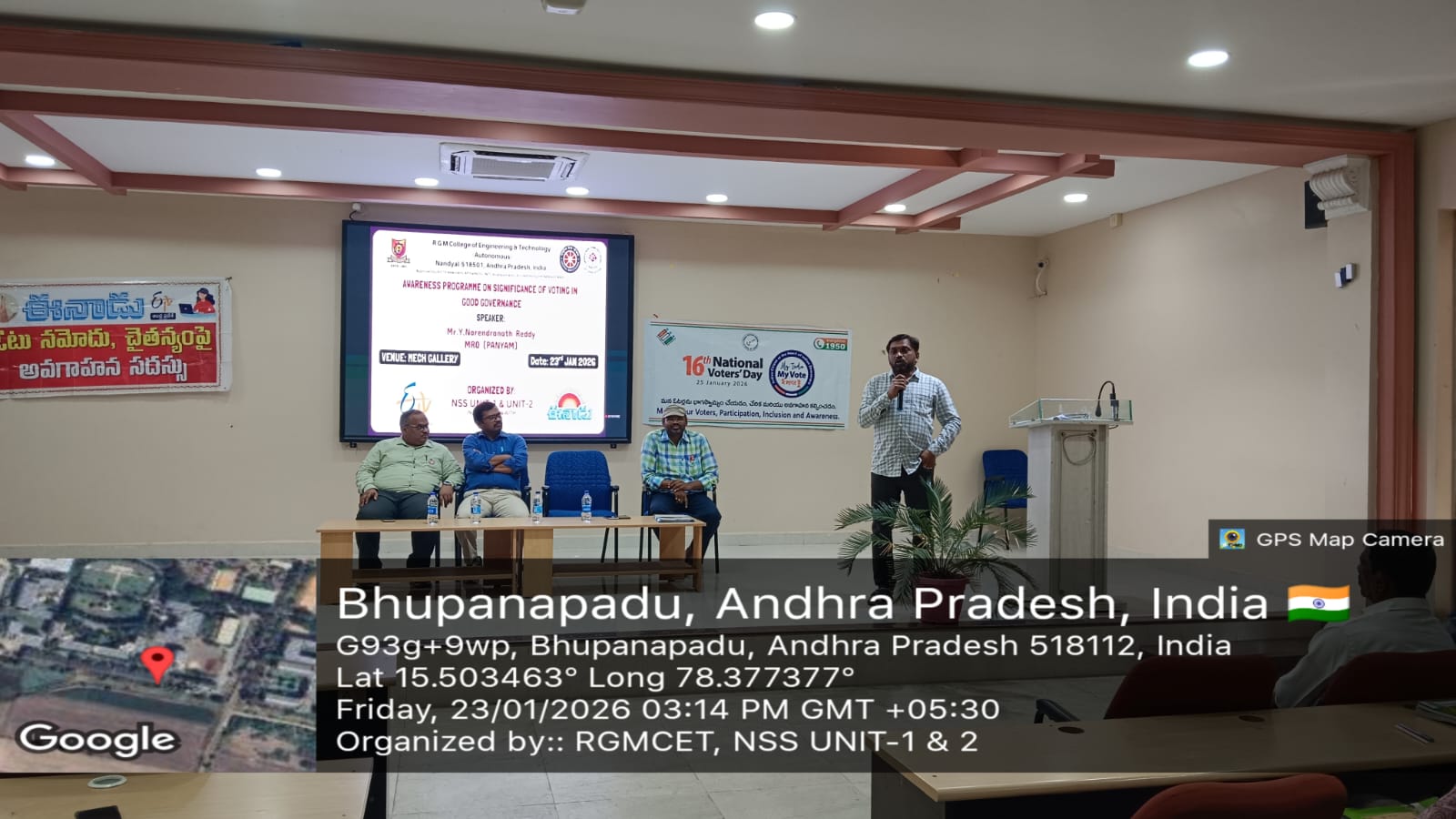 NSS Unit–1 & Unit–2, RGMCET organized an Awareness Programme on the Significance of Voting in Good Governance, delivered by Sri Narendranath Reddy, MRO, Panyam.