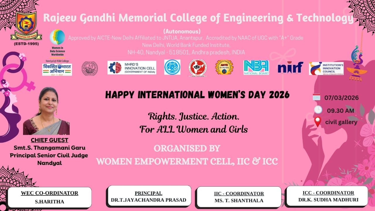 Rajeev Gandhi Memorial College of Engineering and Technology was founded in the year 1995. It is located in a 32.04 acre sprawling campus on NH-40 (old NH-18) at Nandyal, Andhra Pradesh.