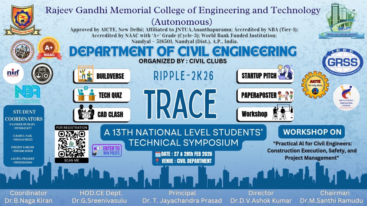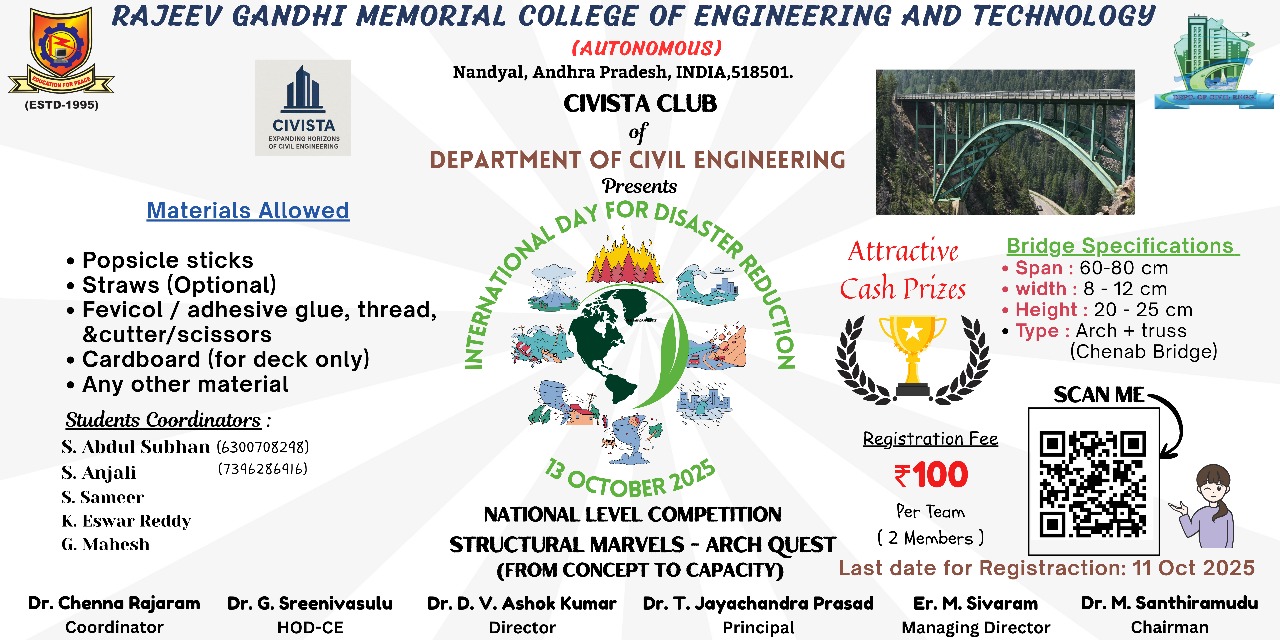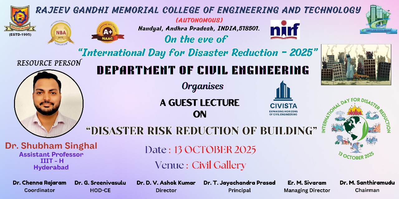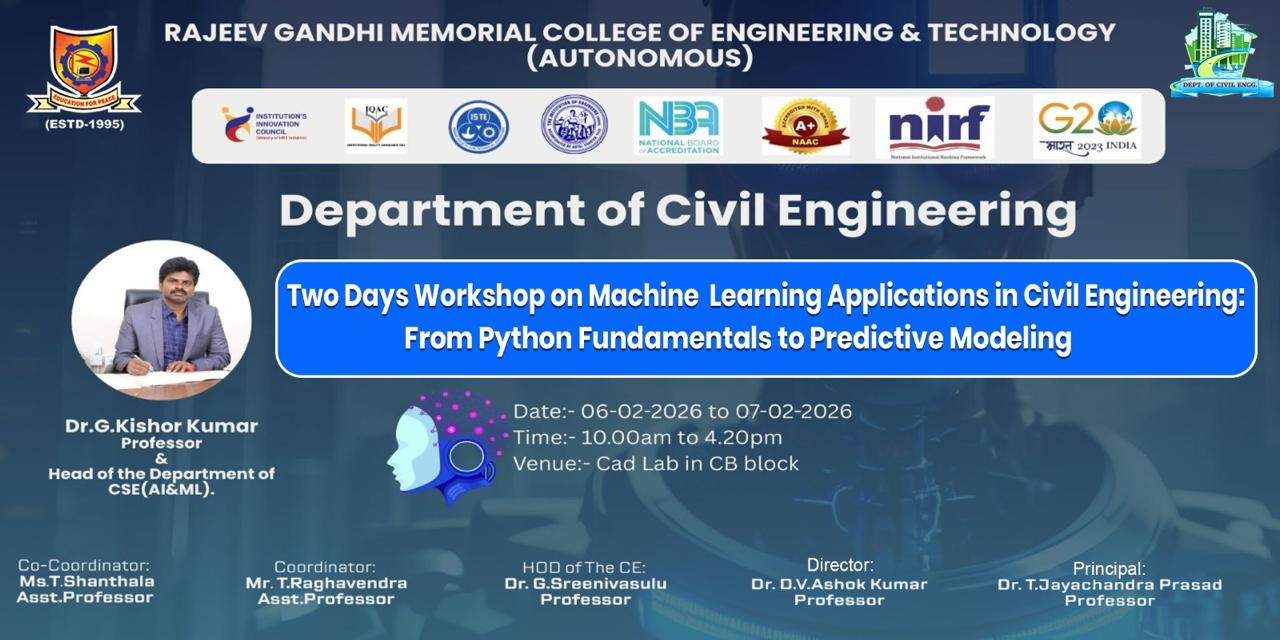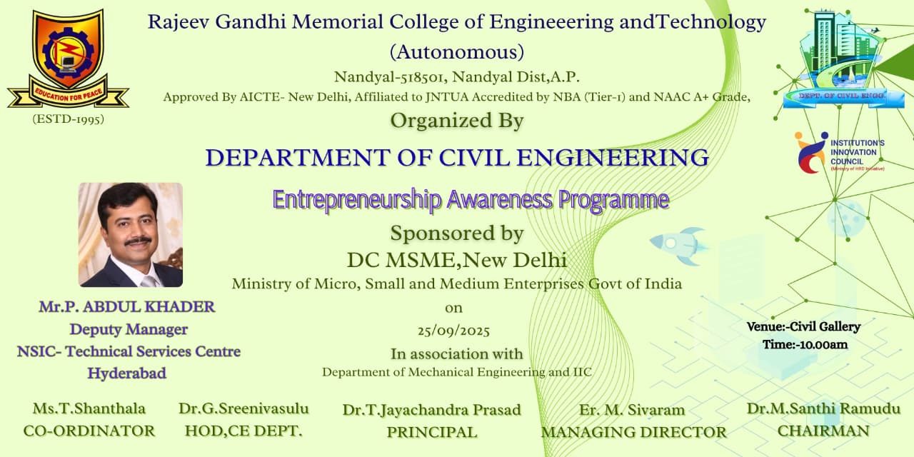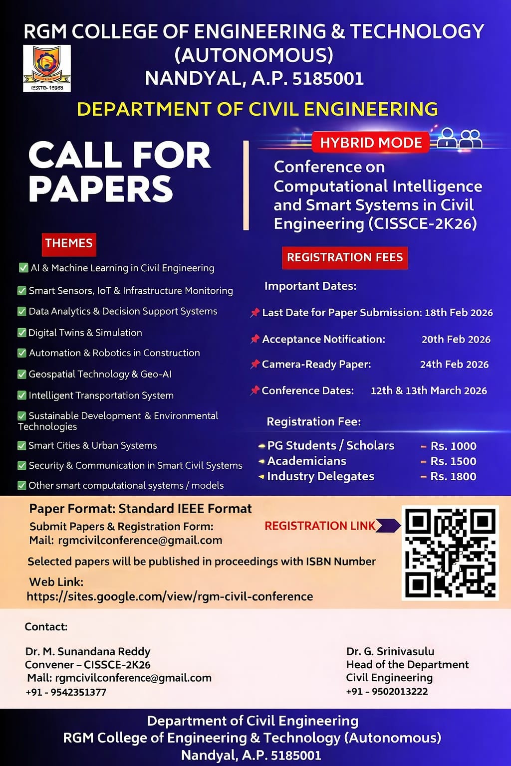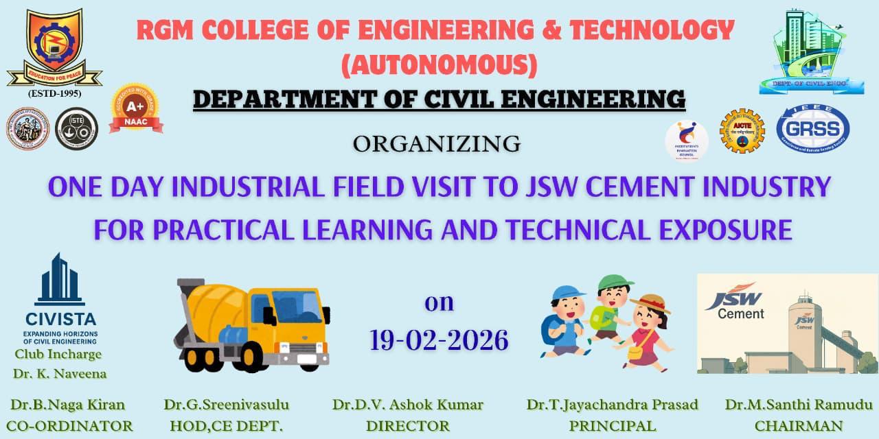 The department has established in the year 2008 with an initial intake of 60 in B.Tech Civil Engineering and at present the intake is 120. The PG course, M.Tech in Computer Aided Structural engineering has started in the year 2014 with an intake of 18. The department has been imparting quality education to meet the technological, advancements and industrial requirements. This has been made possible with highly qualified and dedicated faculty, modern laboratories and infrastructure facilities. The department has Structural, Environmental, Geotechnical, Transportation, Water Resources Engineering, Construction technology and Geo-Informatics divisions. Department has very good infrastructure and institutional facilities such as digital class rooms, state of the art laboratories. Lot of academic activities such as seminars, conferences, work-shops, expert lectures, invited talks, etc., are conducted often apart from intensified research in various domains of Civil Engineering. These academic activities would add up to the reputation and popularity of the department. The main features of the UG program are case studies and Project works in 7th and 8th semesters, MOOCS in 6th and 8th semesters and an extensive practical training on construction sites during their course work which will be useful for better understanding and strengthen their field knowledge. Original research in Civil Engineering is encouraged and facilitated by research faculty. The department possesses well qualified and experienced senior professors and teaching faculty who all can lead the students to become knowledgeable and competent engineers in their professional careers. Many faculties are pursuing their research in the department pertaining to their specialization. Any aspirants who wish to study Civil Engineering course in RGMCET can feel proud that the level of education is on par with highly reputed technical institutions in India. The department offers various designs, testing and consultancy services in all the respective divisions using well equipped state of the art laboratories.