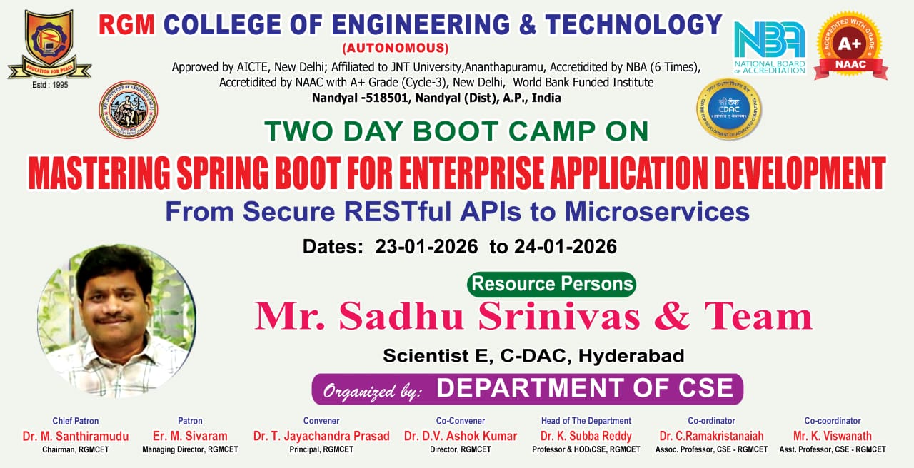 The Department of Computer Science and Engineering (CSE), RGMCET, Nandyal, was established in the year 1995 with a modest intake of 40 students. Over the years it has grown by leaps and bounds and presently offers the B.Tech course in Computer Science and Engineering with a sanctioned intake of 420 students. The Department also offers a P.G. course in Computer Science with an intake of 9. The Department has been recognized as a Research Centre to offer Full Time Doctoral Program in Computer Science and Engineering, under Jawaharlal Nehru Technology University (JNTUA), Ananthapuramu, Andhra Pradesh. The Department is vigorously undertaking research and development activities in emerging thrust areas, introducing new innovative courses based on the industry needs, while collaborating with National and International Institutions, R & D organizations and Industries. The Department has contributed substantially to the NAAC accreditation of RGMCET with A+, making the college one of the twelve colleges in India to receive this honor.