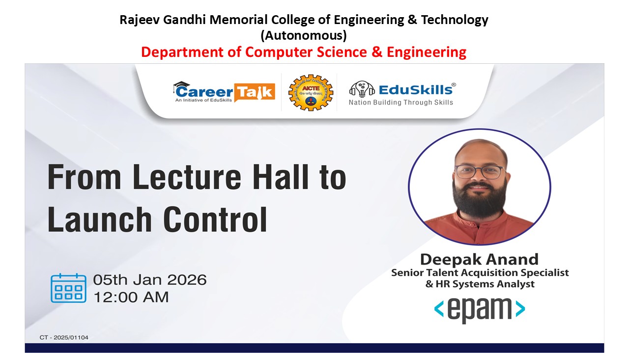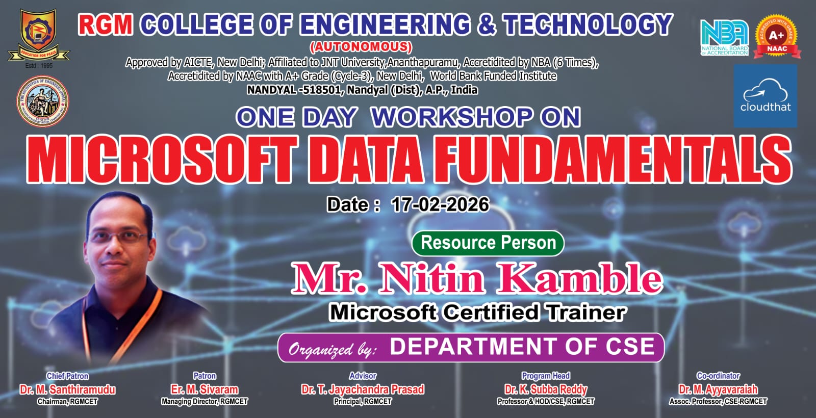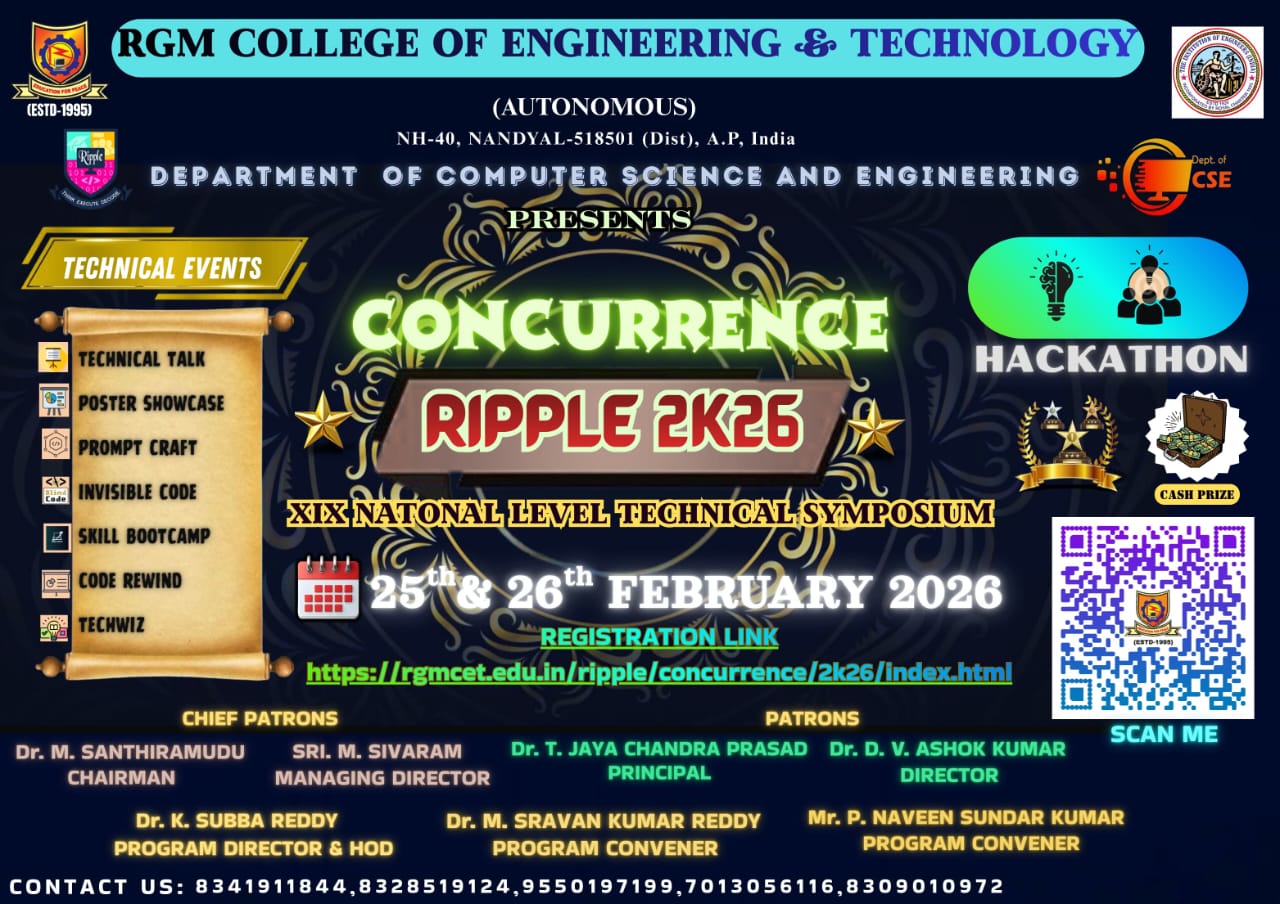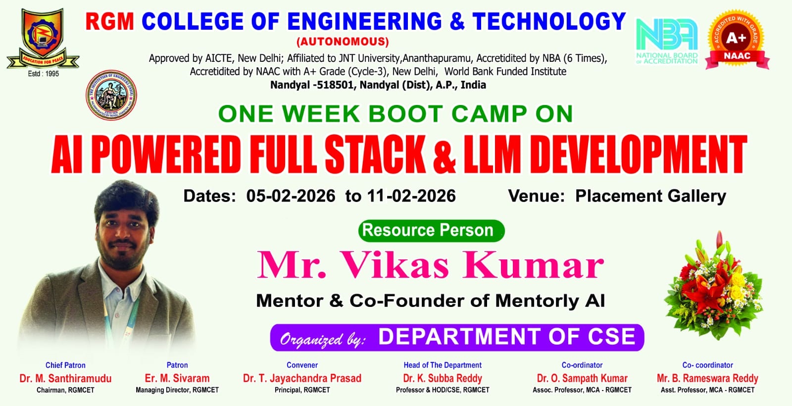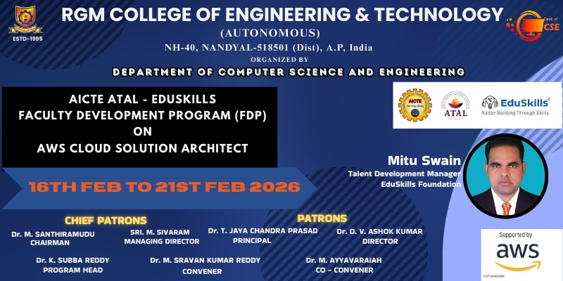 The Department of Computer Science and Engineering (CSE), RGMCET, Nandyal, was established in the year 1995 with a modest intake of 40 students. Over the years it has grown by leaps and bounds and presently offers the B.Tech course in Computer Science and Engineering with a sanctioned intake of 420 students. The Department also offers a P.G. course in Computer Science with an intake of 9. The Department has been recognized as a Research Centre to offer Full Time Doctoral Program in Computer Science and Engineering, under Jawaharlal Nehru Technology University (JNTUA), Ananthapuramu, Andhra Pradesh. The Department is vigorously undertaking research and development activities in emerging thrust areas, introducing new innovative courses based on the industry needs, while collaborating with National and International Institutions, R & D organizations and Industries. The Department has contributed substantially to the NAAC accreditation of RGMCET with A+, making the college one of the twelve colleges in India to receive this honor.