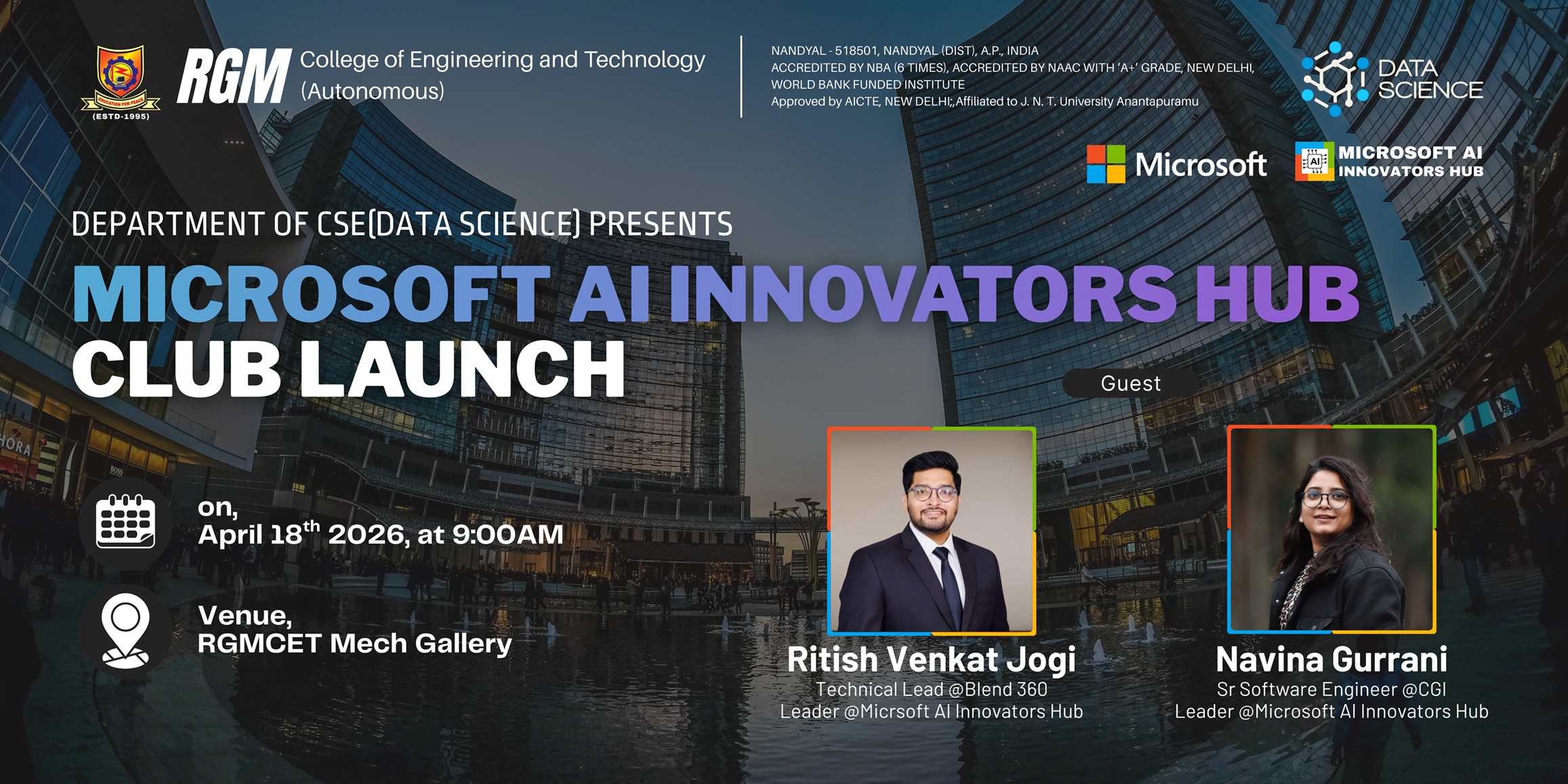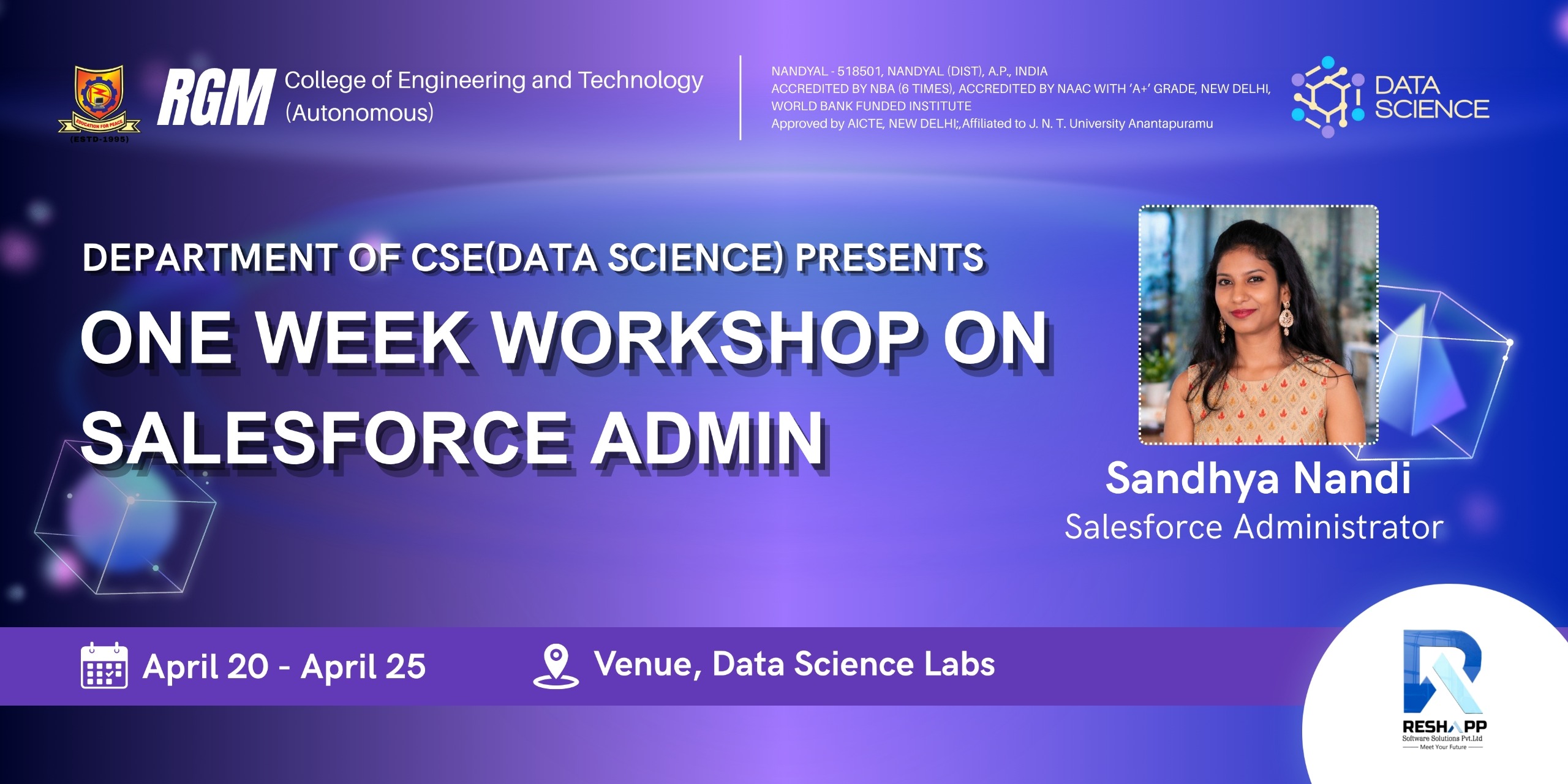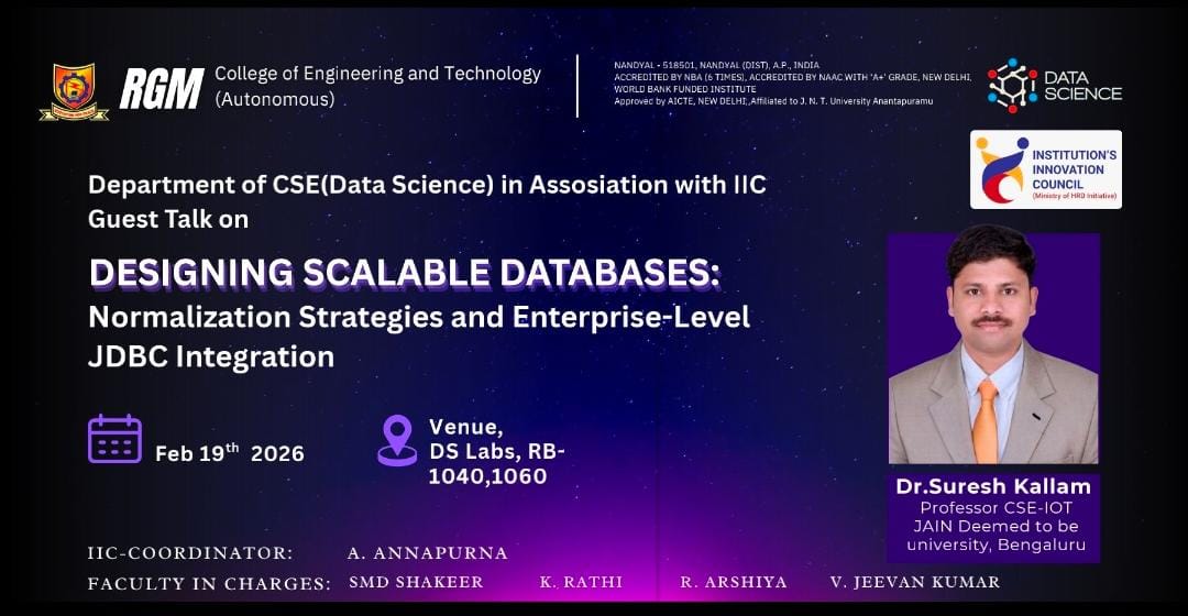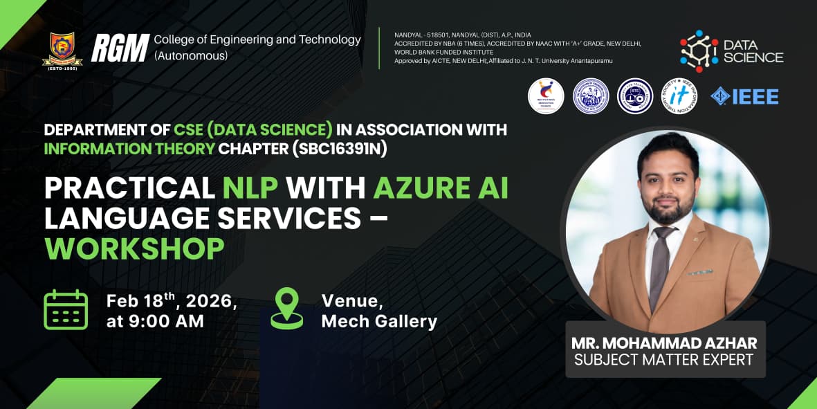 Given the mounting importance of the data science paradigm, RGMCET has decided to start a new 4 years bachelor program on Computer Science and Engineering with a specialization Data Science. The curriculum of the this program focuses on exposing to the students with the essentials of applied statistics, applied mathematics, and computer science required in the context of data science and its applications with strong emphasis on having hands-on experience with the help of practicum, labs and experience of dealing with real-world problems.
