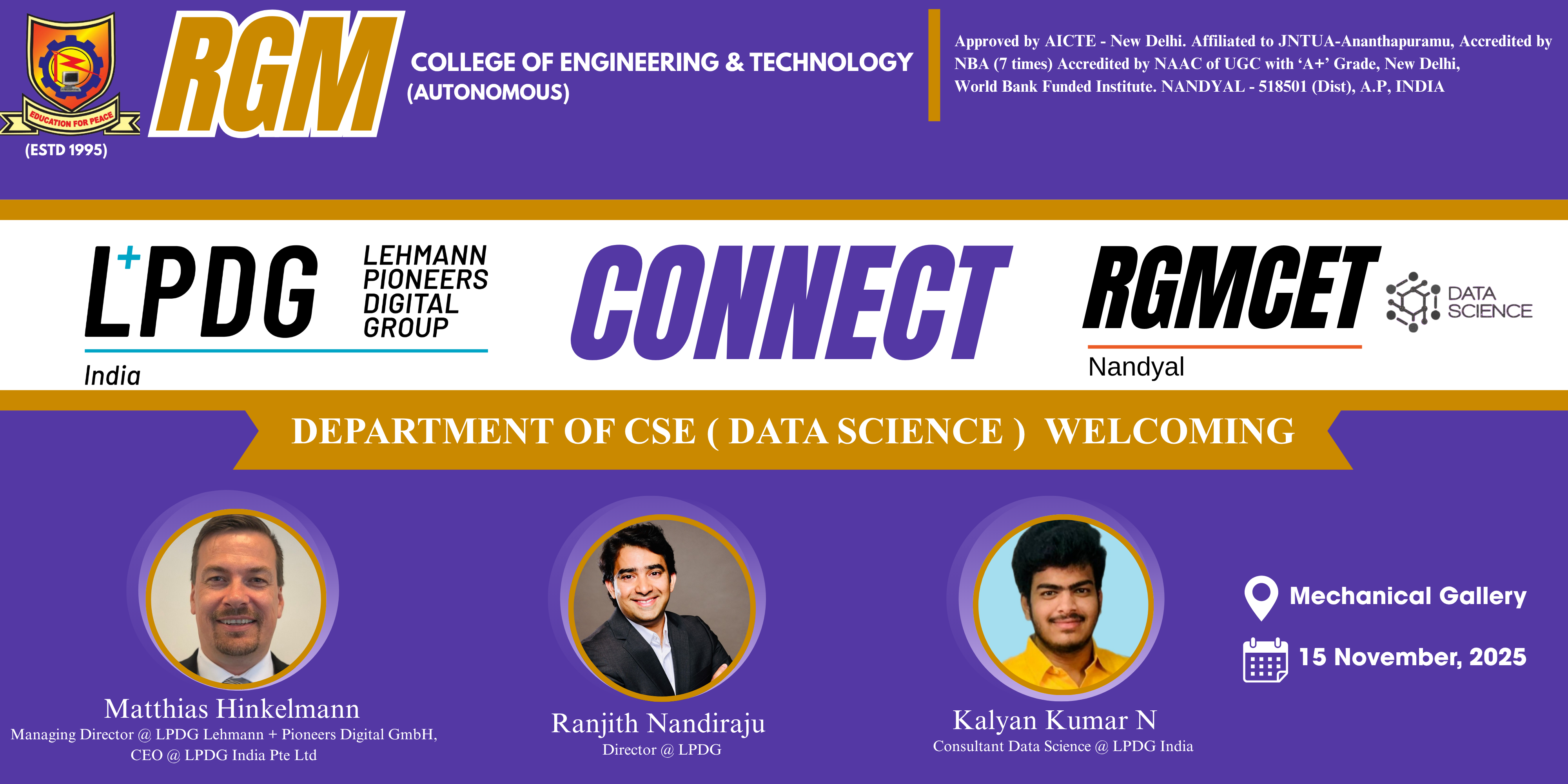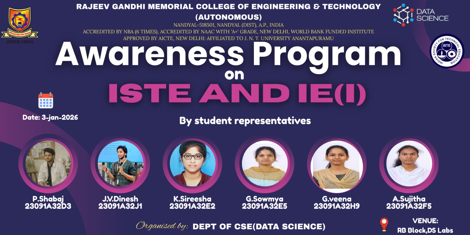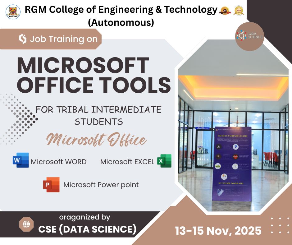 Given the mounting importance of the data science paradigm, RGMCET has decided to start a new 4 years bachelor program on Computer Science and Engineering with a specialization Data Science. The curriculum of the this program focuses on exposing to the students with the essentials of applied statistics, applied mathematics, and computer science required in the context of data science and its applications with strong emphasis on having hands-on experience with the help of practicum, labs and experience of dealing with real-world problems.