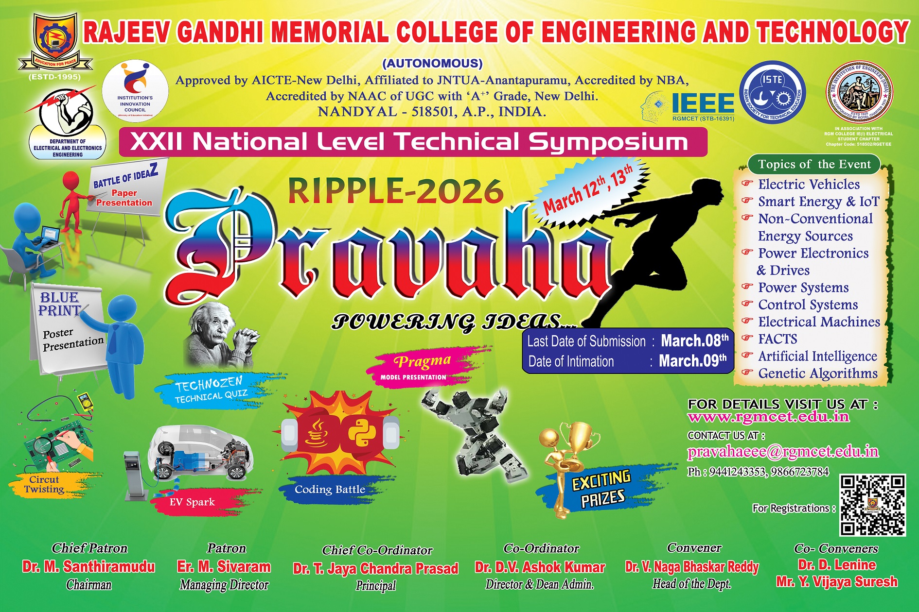 The Department is committed to produce well-trained electrical graduates. This department has received twice ISO certification, NBA-AICTE accreditation four times i.e.; in the years 2003, 2007,2013 and 2017, accredited by NAAC in two cycles with ‘A’ Grade in the year 2012 and A+ in the year 2017. The Department is conferred with autonomous status from 2010 and permanent affiliation with JNTUA, Anantapuramu. Department of EEE is credited with UGC 2(f) and 12(b) status to grab research funds from UGC, AICTE and DST.