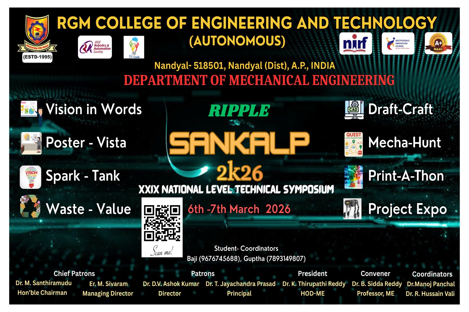 The Department of Mechanical Engineering has been functioning since the inception of the Institute i.e, 1995 and is offering UG : B.Tech course in Mechanical Engineering with an intake of 120 & PG : M.Tech in Energy Engineering with an intake of 09. Department has been accredited by NBA Tier-I. The department has been recognized as a research center by JNTUA-Anantapur to carry out Ph.D Program on regular basis. The Department has completed research projects worth of Rs. 2.00 crores.